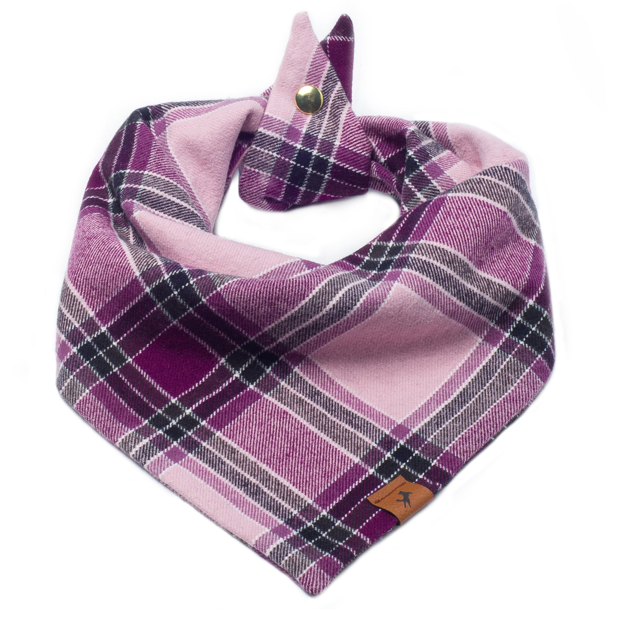 Our easy-to-use tie-on/snap Purple Plaid Dog Bandana combines style and functionality for your furry friend. It's perfect for dogs of all sizes and features a convenient snap closure and a tie for a secure fit. Crafted from 100% brushed cotton, it's comfortable for your pet and machine washable for effortless care. This bandana adds a fashionable touch, whether for a special occasion or an everyday walk in the park. Available in multiple sizes to suit every dog!