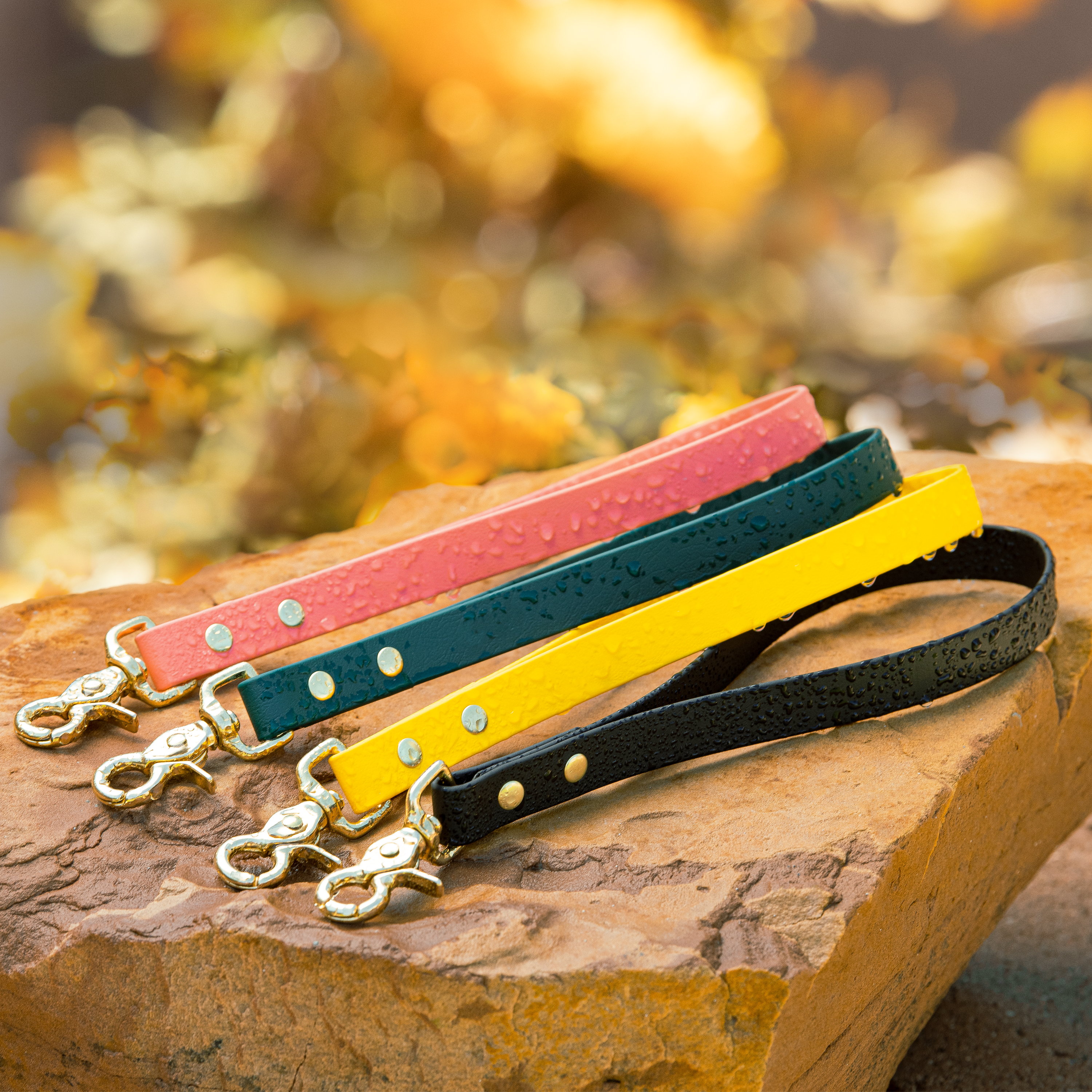 We only use Genuine BioThane® on our leashes and collars. BioThane® is a Polymer-coated webbing. The Polymer coating makes this webbing a great leather alternative, as it is more durable, waterproof, and easy to clean. BioThane® rinses clean in seconds, will not mold or mildew, and will not absorb odors. BioThane® is manufactured in the USA. Regular cleaning is recommended to keep your BioThane gear looking new.